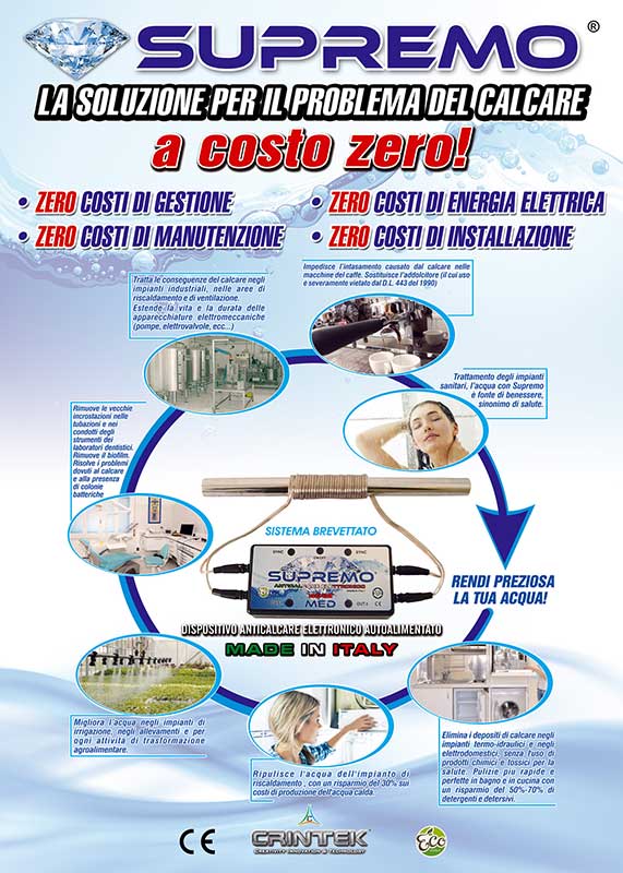 supremo-ionic_brochure-immagine2SUPREMO è il primo dispositivo lnibitore di Calcare a Tecnologia Ionica Bioenergetica Il trattamento dell’acqua è senza alcun contatto diretto o modifica dell’impianto idrico.